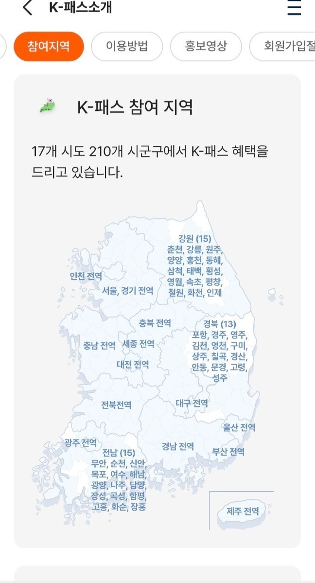 K-패스 참여지역은 17개 도시 210개 시군구에서 K-패스 혜택을 받을 수 있는데요. 대중교통을 이용중이라면 이런 좋은 혜택을 놓치지 마세요.
